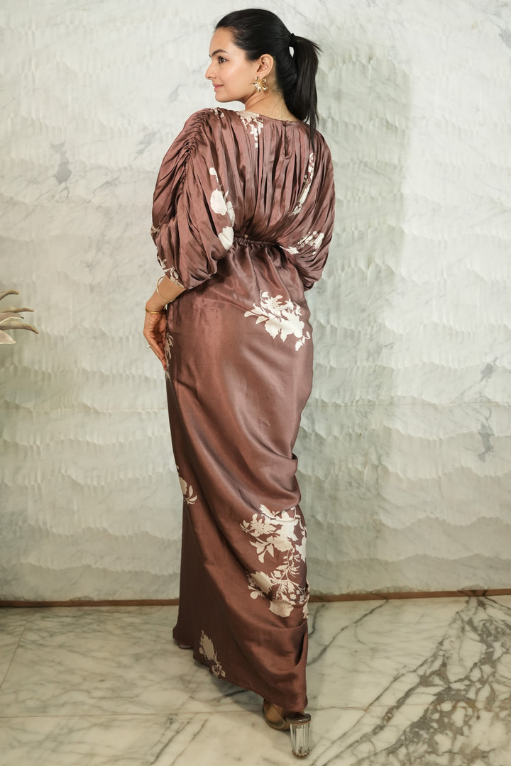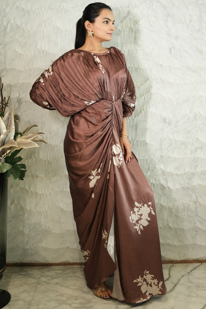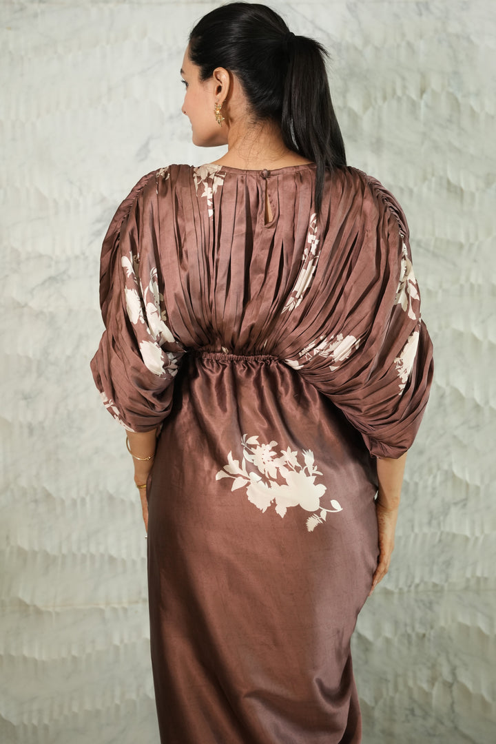 Elevate your wardrobe with Mush Clothing’s Brown and White Floral Printed French Crepe Pleated Dress with Front Slit. This stunning piece, crafted from high-quality French crepe, features an elegant brown and white floral print, giving it a timeless and chic appeal. The rich, earthy tones and intricate floral patterns create a sophisticated look that’s perfect for both day and night occasions.