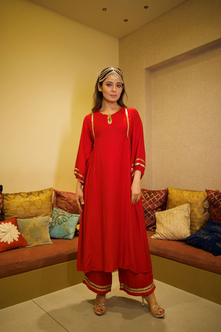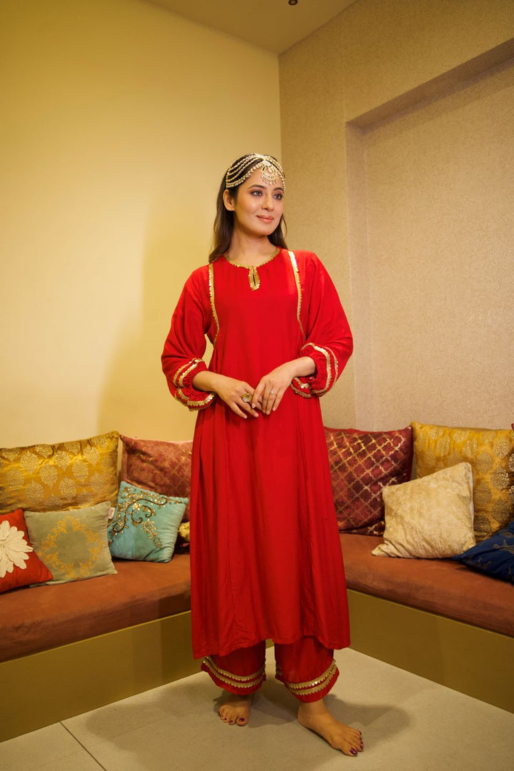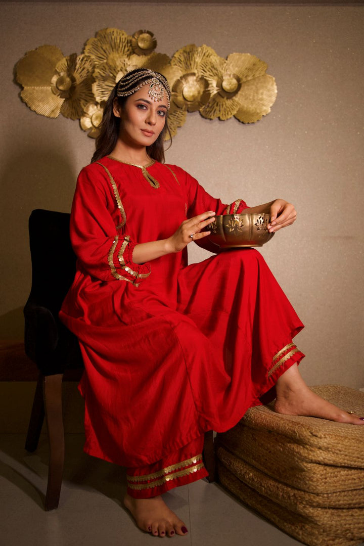 Adorned with delicate golden sequin lace on the neckline, sleeves, and pant hems, this look blends traditional charm with modern ease. The soft, breathable fabric ensures comfort while keeping your style festive and graceful.
