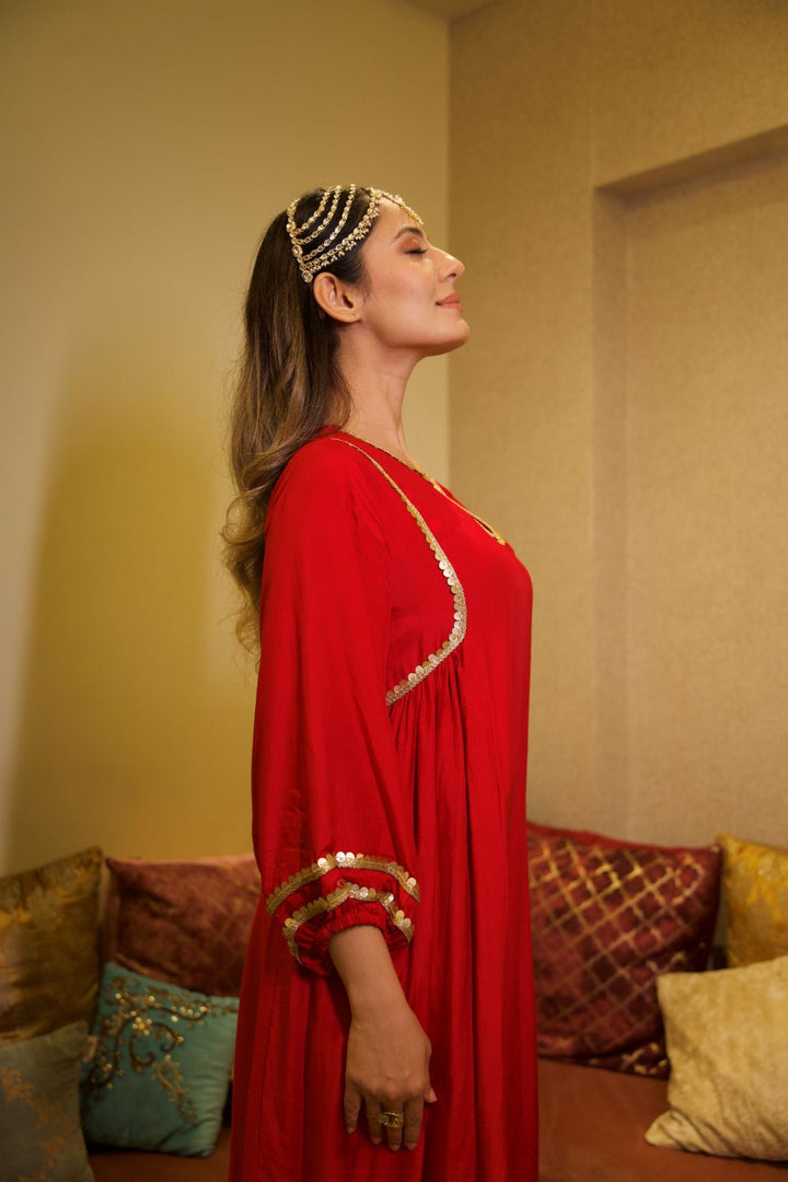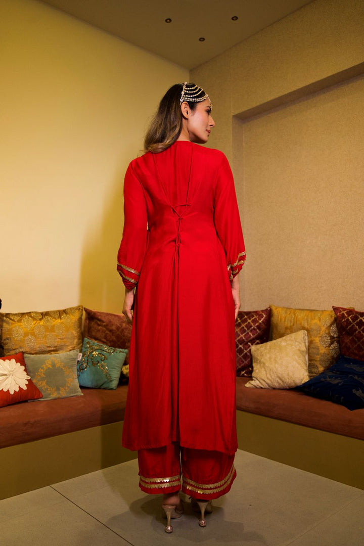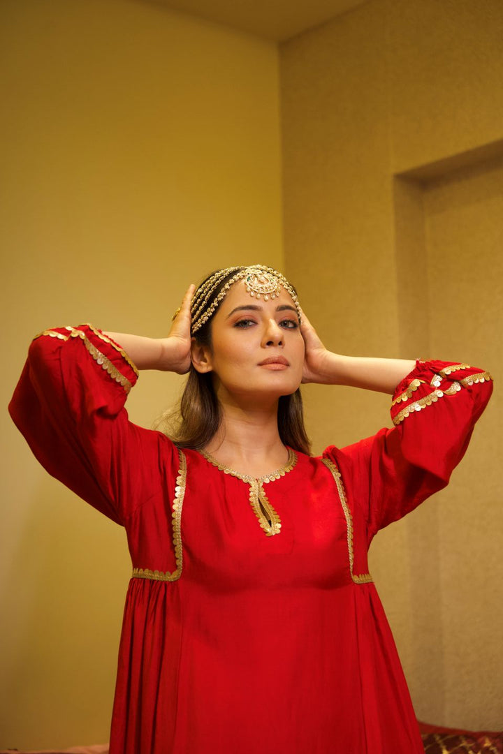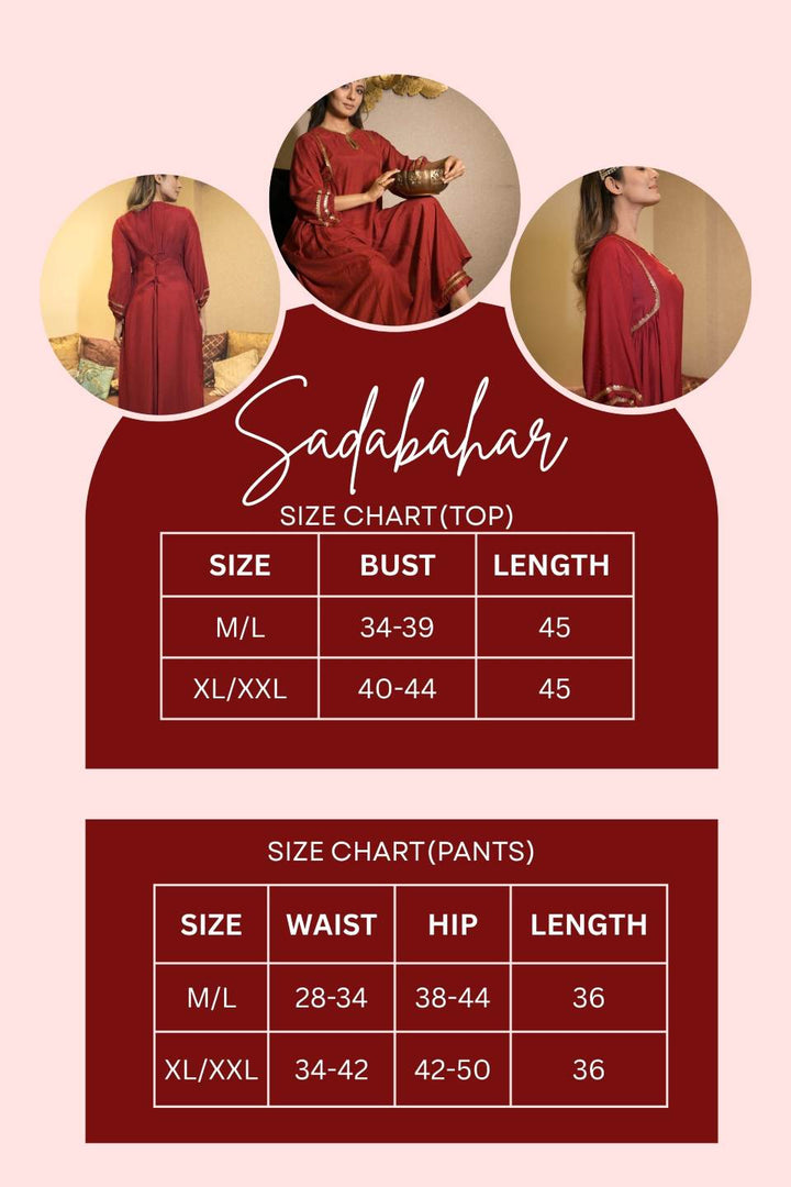 Gracefully crafted for the festive season, the Sadabahar coord set from our Guldasta collection is a timeless expression of elegance. This maroon ensemble features a flared kurta with beautifully placed panels that add fluidity to every step. The silhouette is enhanced by a dori tie-up at the back, subtly accentuating the waist and curves for a flattering fit.